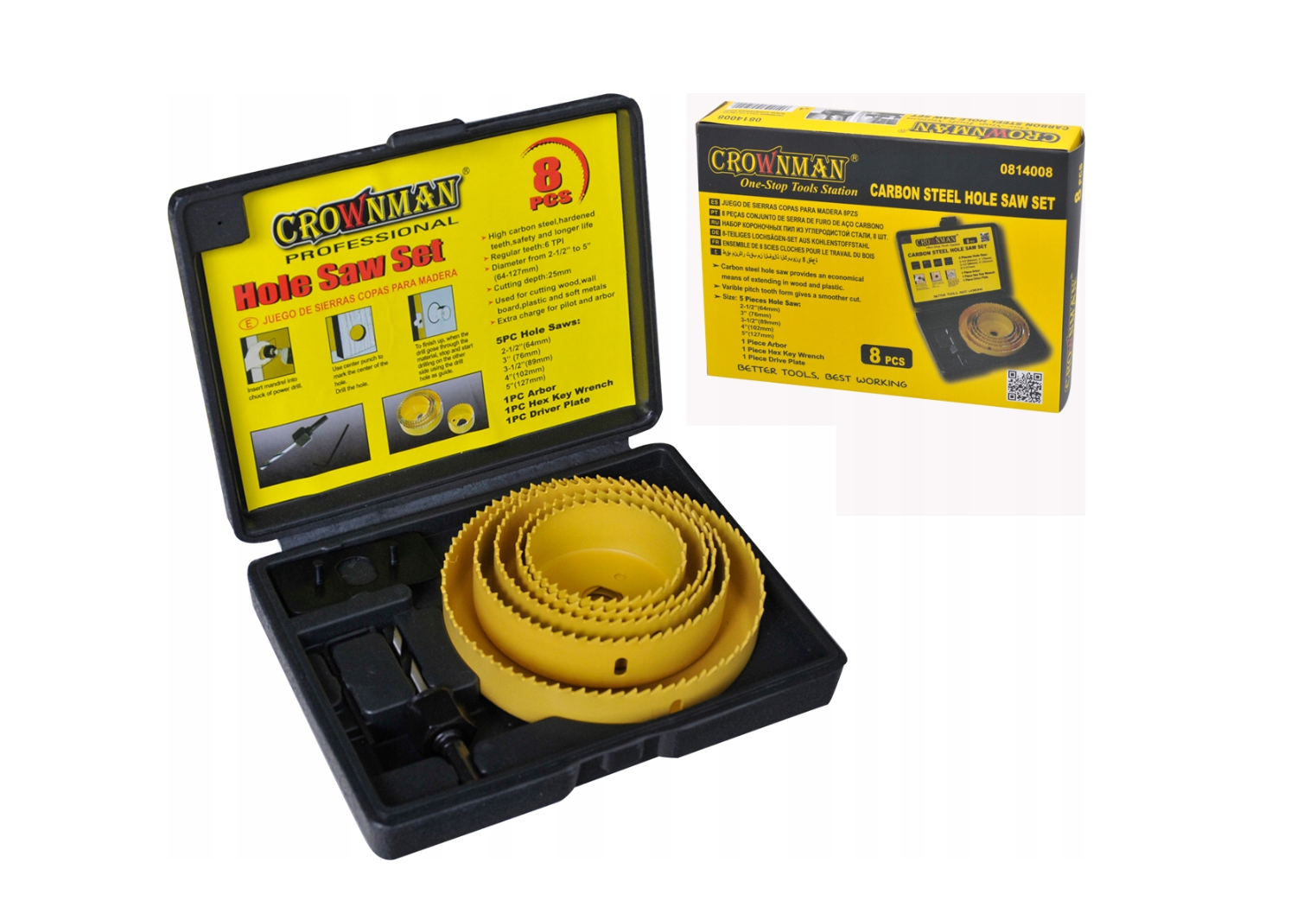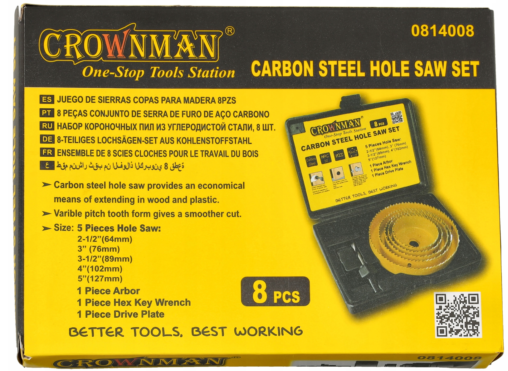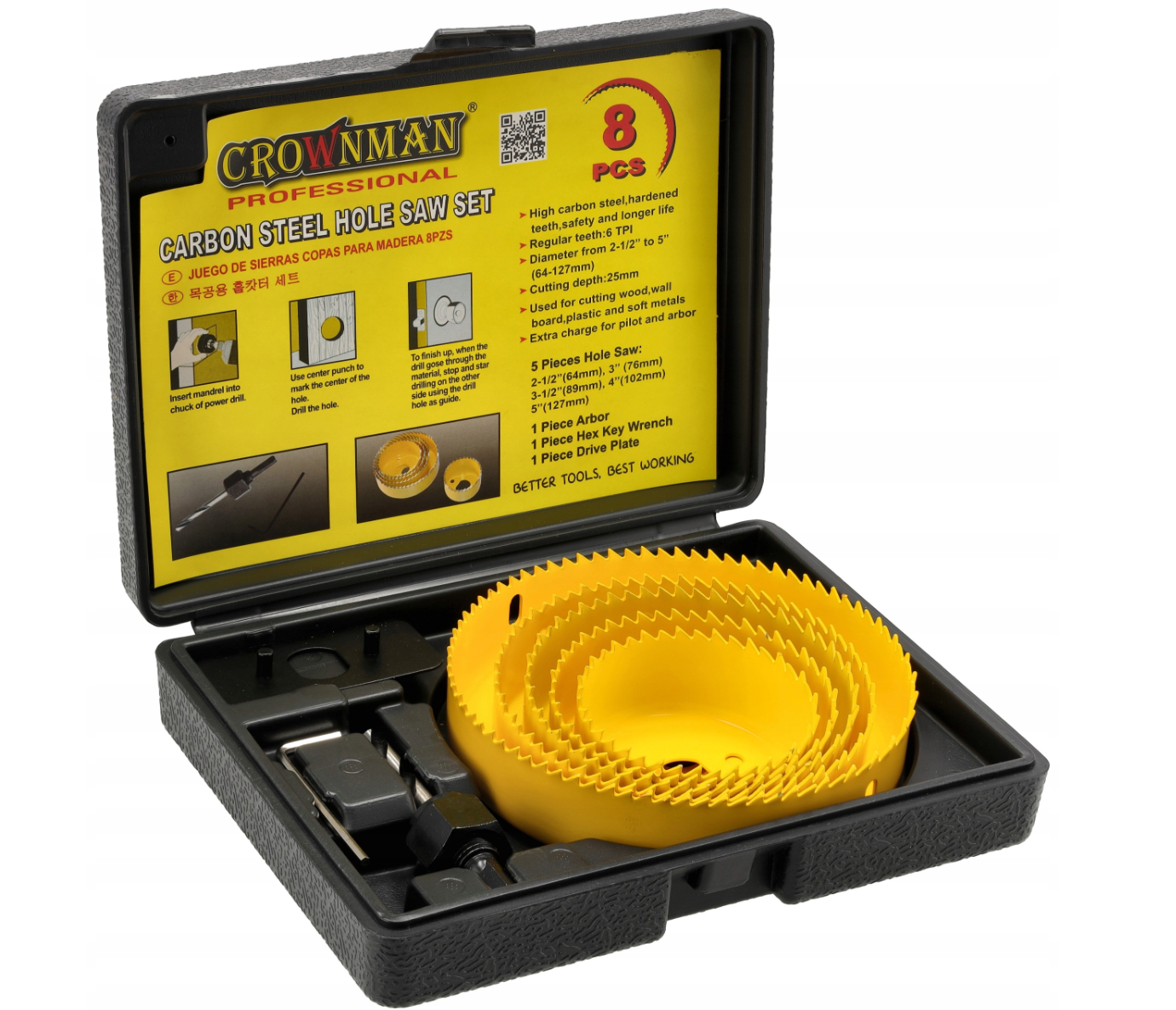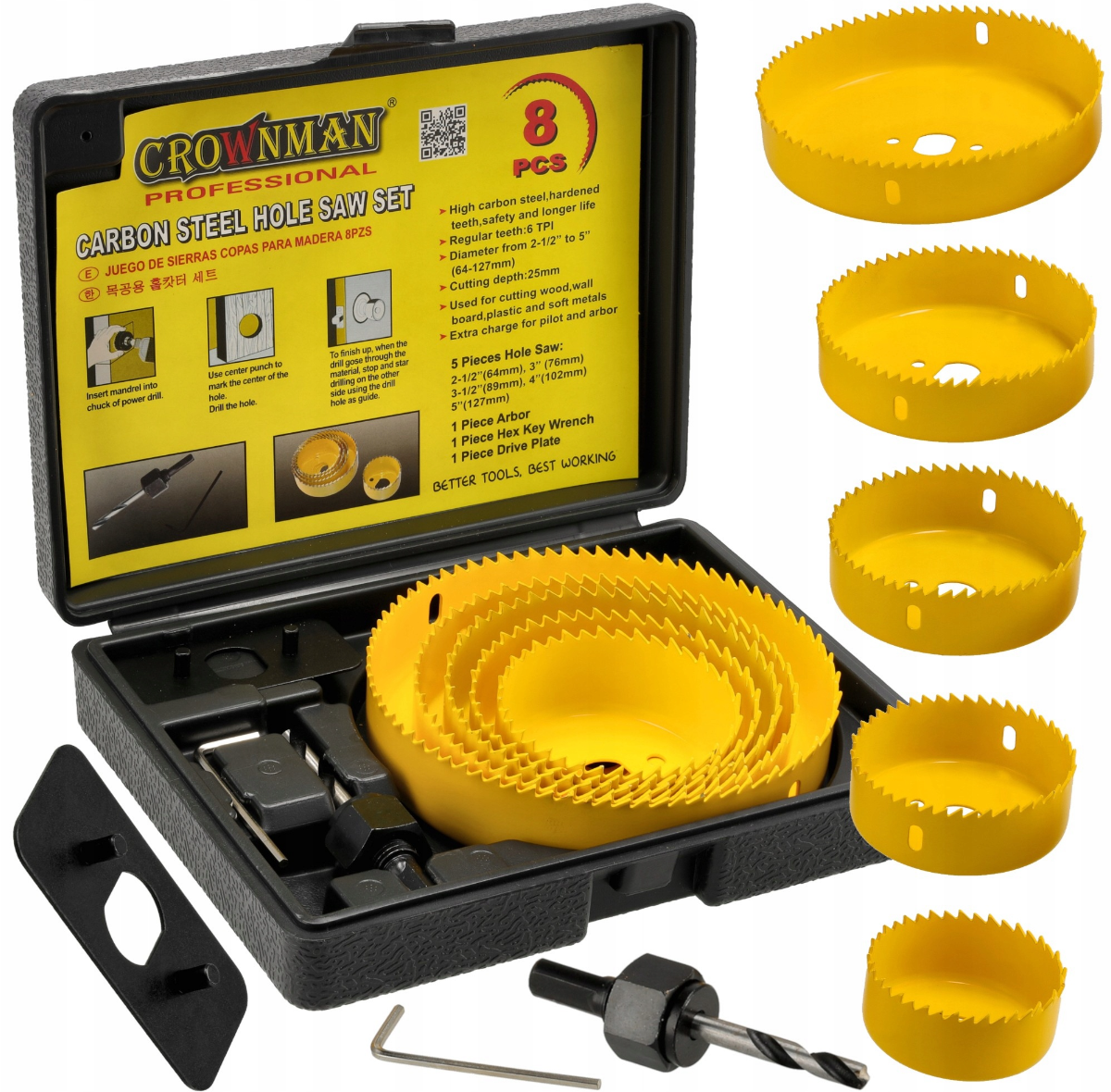 Główne cechy produktu: ✅ Wysokiej jakości materiały: Otwornice wykonane ze stali węglowej (carbon steel) o twardości HRC 50, co zapewnia ich dużą trwałość i odporność na zużycie. ✅ Zestaw 8 elementów: Zestaw składa się z pięciu otwornic o rozmiarach: