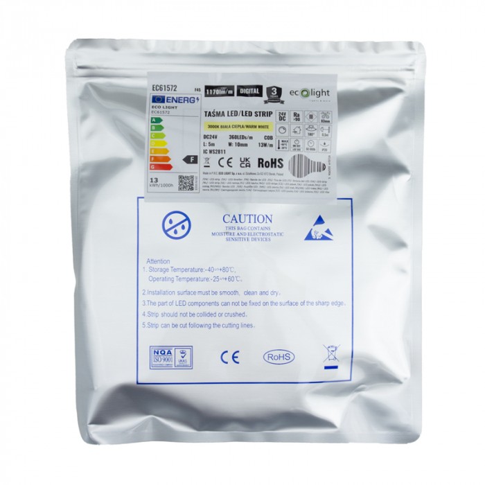 ✔️ Dane techniczneTyp: Taśma LED cyfrowa COB Rodzaj diod: COB Ilość diod: 360 LED/m Barwa światła: biała ciepła Temperatura barwowa: 3000K Strumień świetlny: 1170 lm/m Moc: 13 W/m Skuteczność: ok. 90 lm/W Napięcie zasilania: 24V DC Kąt świecenia: 120° Stopień szczelności: IP20 Długość rolki: 5 m Łączny strumień (rolka): ok. 5850 lm Szerokość: 10 mm Możliwość cięcia: co 8,3 cm Klasa energetyczna: F |
